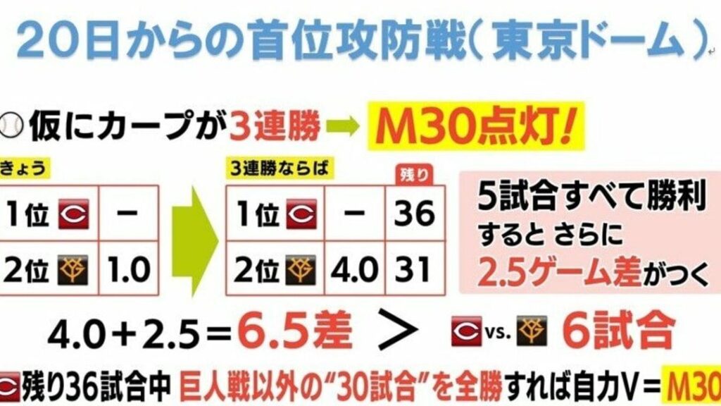 巨人のマジックは、チームがリーグ優勝を確定させるための重要な要素です。この仕組みでは、勝利数と他チームの成績が密接に関連しています。