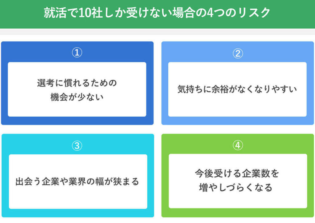 また、別の友達に聞いた話では、10社程度に絞ったものの、各企業に対して十分なリサーチと準備を行った。**その結果、彼は希望する業界から内定を受けることができた。**この例から、私たちは応募数の質を重視することで成功が見込めることを実感した。