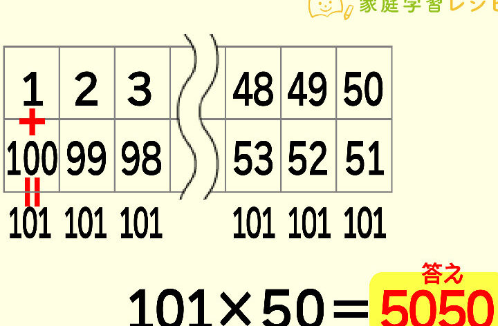 - 合計 = 100 × (100 + 1) / 2 = 100 × 101 / 2 = 5050