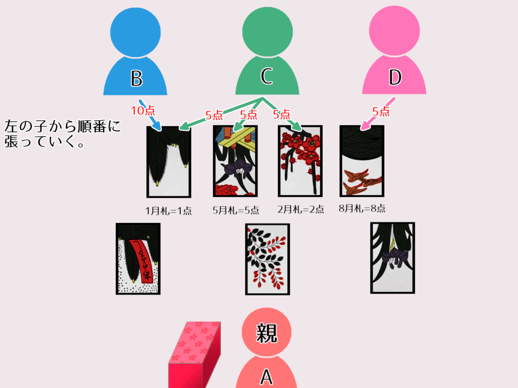 - 役: 役は、特定の組み合わせを揃えることによって得られる得点です。例えば、同じ月のカードを揃える「対子」や、カードの点数を合計して点数を競う「おいちょかぶ」があります。