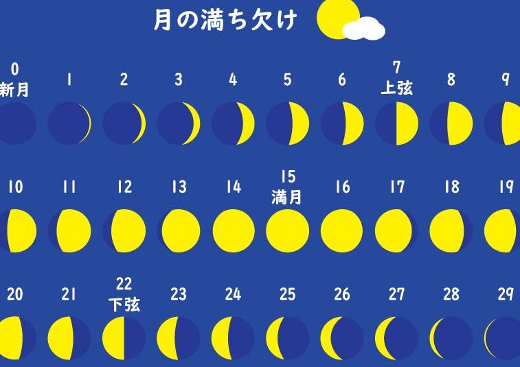 月の満ち欠けは、地球から見た月の形の変化を指します。この変化は、月の位置と太陽の位置によるもので、主に新月、上弦の月、満月、下弦の月の4つの相が繰り返されます。このサイクルは約29.5日かかります。