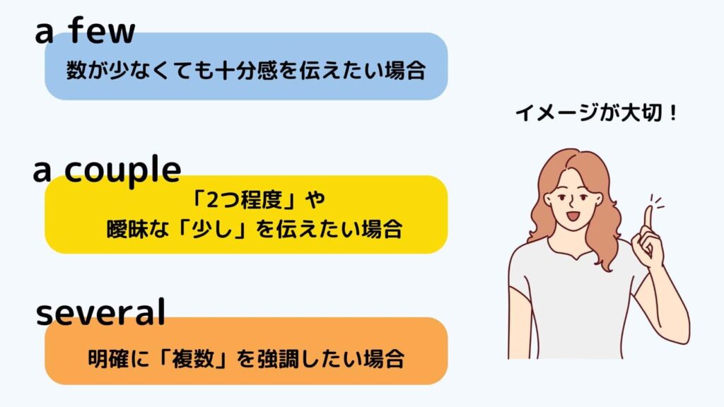 - いくつかの:明確に複数であることを示す表現です。例えば、「いくつかの選択肢」や「いくつかのアイデア」が挙げられます。この場合、少なくとも3つ以上を指すことが一般的です。