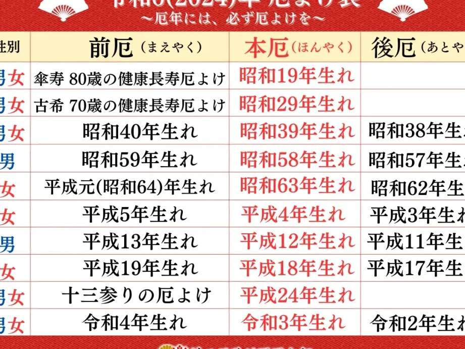 厄年には一般的に男性と女性のそれぞれに該当する年齢があります。具体的には以下の通りです:
