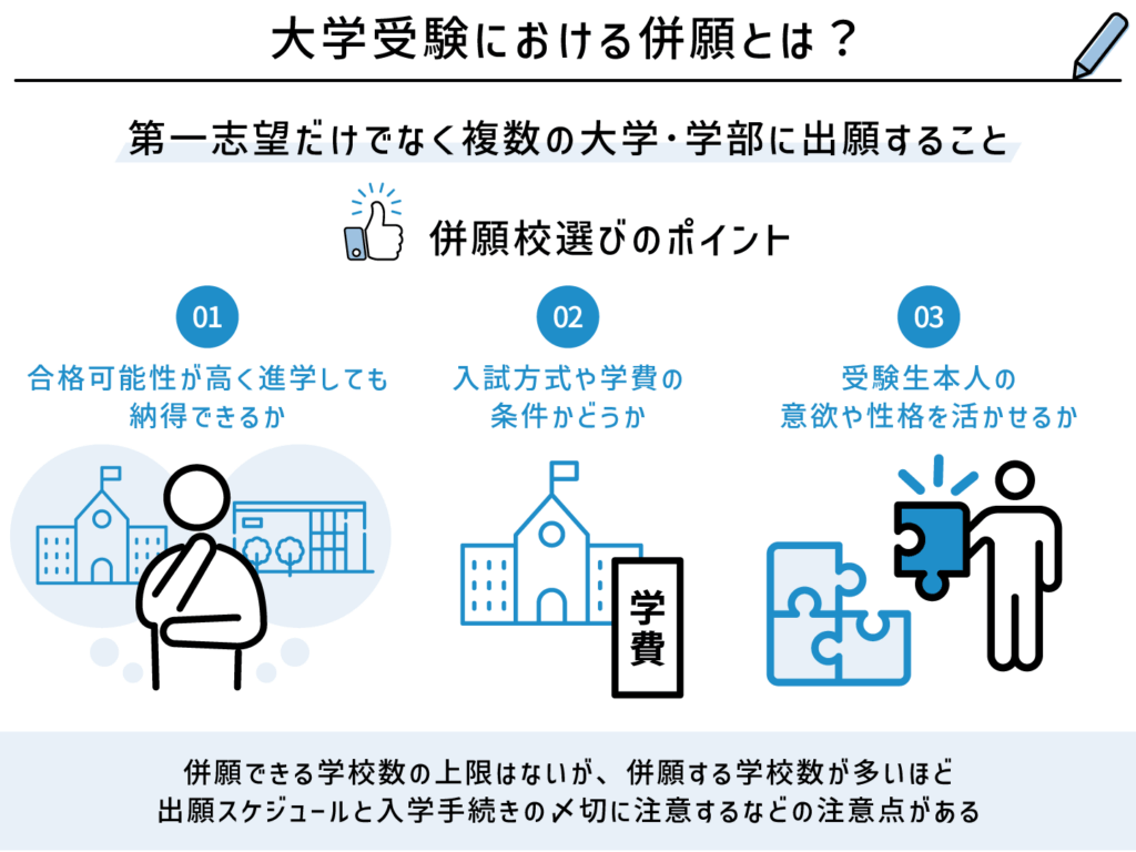 併願校数については、一概には言えませんが、自分自身の実力や受験科目、試験日程などを考慮しながら決定する必要があります。一般的には以下の基準が参考になります: