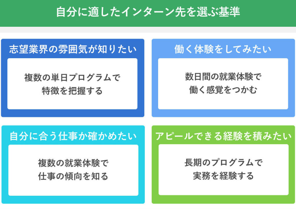 - 専門性: 我々が目指す業界や職種によって求められる経験が異なるため、その専門性に応じて必要なインターンシップも変わります。