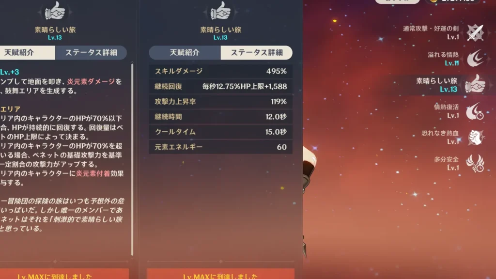 また、彼の元素チャージにはHP回復効果もあります。この効果は戦闘中に味方キャラクターが受けたダメージを補うために非常に有効であり、生存率を向上させる要素となります。特に長期戦では、このHP回復が勝敗を左右することもあります。