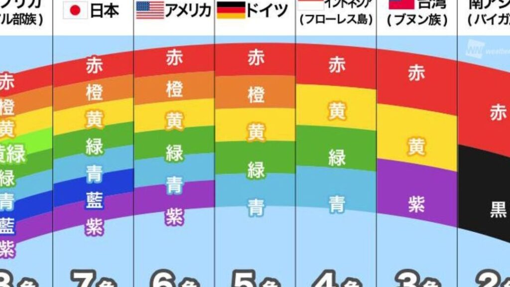 これらの色は、人間の目で認識できる光の波長に基づいており、それぞれ異なる周波数を持っています。このように、科学的には7色が基本ですが、人々が文化や地域によってどんな風に捉えるかによって変化します。