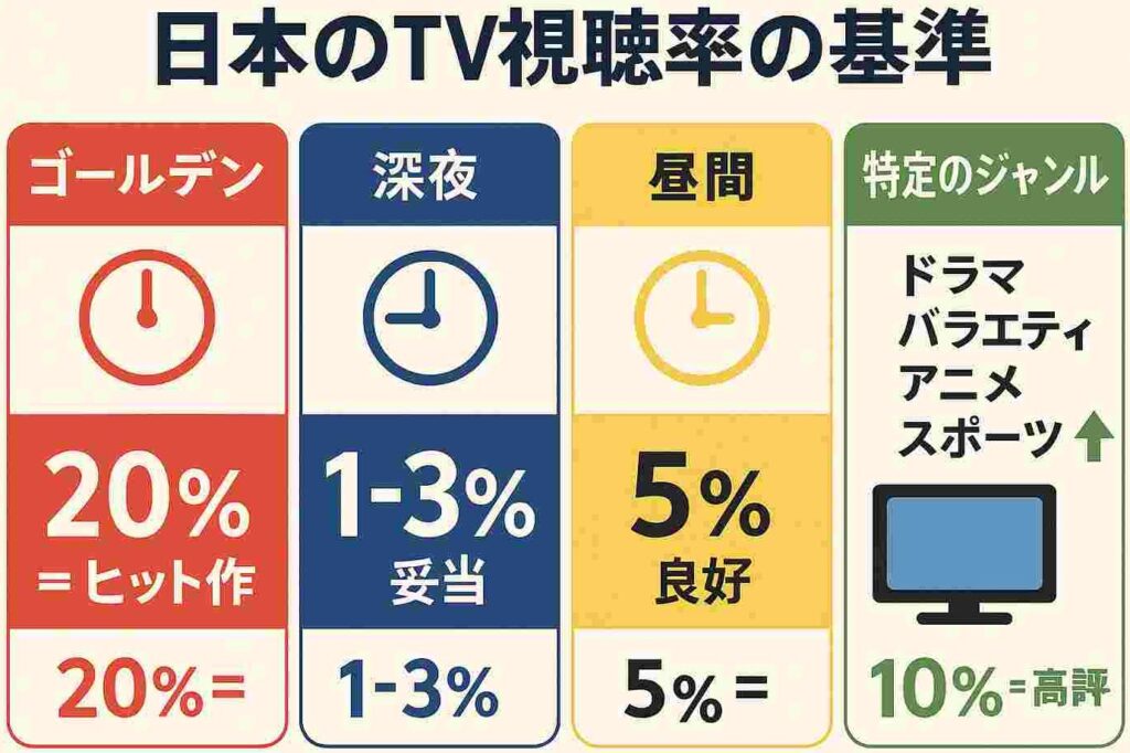 - ターゲット層: 番組が狙う特定の年齢層や性別によって、高い視聴率となる閾値(しきい値)が異なる場合があります。
