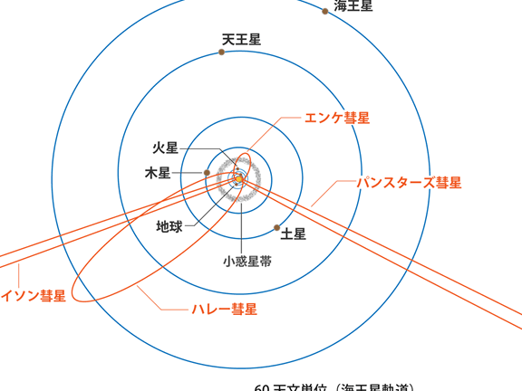 短周期彗星は、おおよそ200年以内で太陽を一周します。例えば、有名なハレー彗星(Halley’s Comet)は約76年ごとに地球に近づきます。