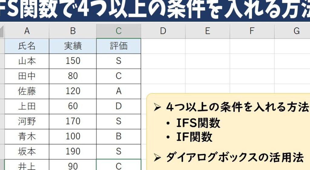 =IFS(A1>=90, “A”, A1>=80, “B”, A1>=70, “C”, A1>=60, “D”, TRUE, “再試験”)