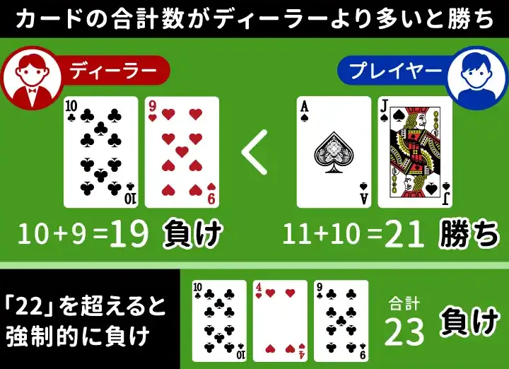 - ディーラーとの比較: ゲーム終了時に自分の手札がディーラーよりも高ければ勝利します。
