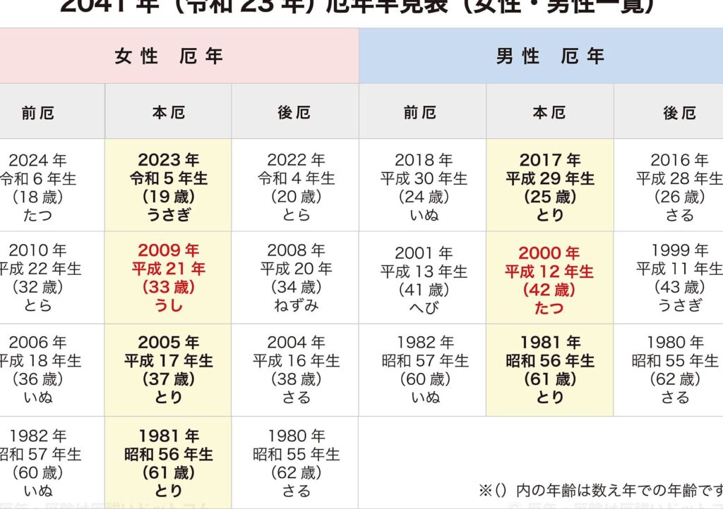 上記の表からわかるように、2023年には特に26歳と43歳が本厄として位置付けられています。これらの年代は運勢や健康面で注意が必要とされていますので、意識して過ごすことが大切です。また、その周囲にも配慮し、一緒にこの時期を乗り越えるサポートを行うことも良いでしょう。