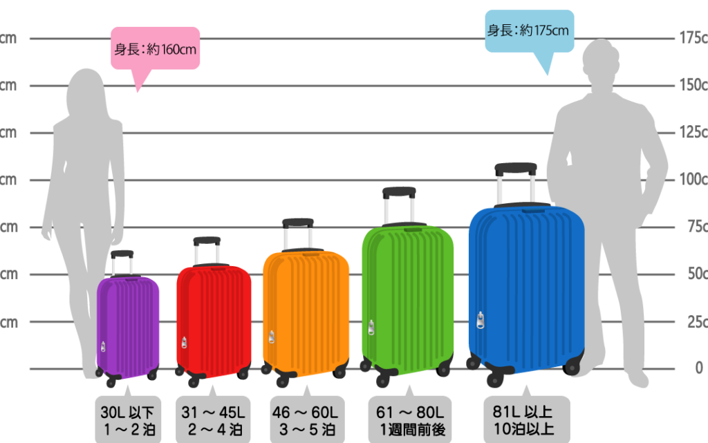 - 中型(1週間程度用): 家族旅行や少し長めの滞在に適している。