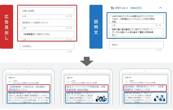 - 柔軟性: 広告主は複数の見出しと説明文を設定でき、それによってGoogleが最も関連性の高い広告を選択します。