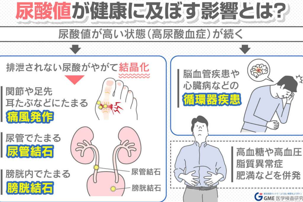 尿酸値が上昇すると、体内でさまざまな問題が起こる可能性があります。具体的には以下のような症状や疾患につながることがあります: