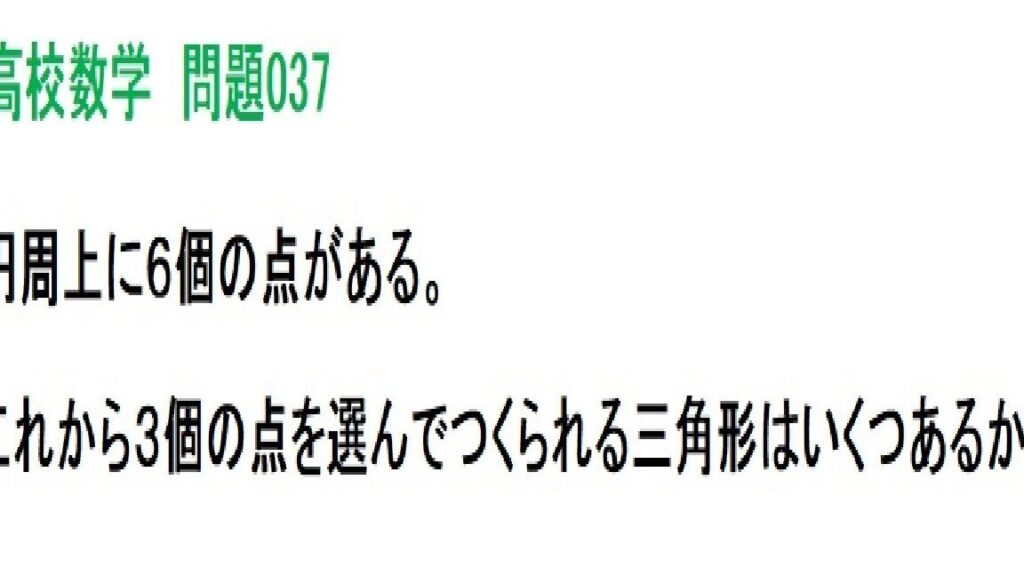 私たちは、円周上に6個の点がある。この6個の点の中から3点を結んで出来る三角形はいくつあるかという問題に対して具体的な数学的アプローチを採用します。この問題は組み合わせ論に基づいており、特定の公式を用いることで迅速に解決できます。まず、3点を選ぶためには、与えられた6点から任意の3点を選ぶ必要があります。