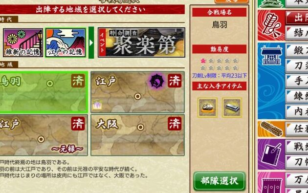 - 編成の工夫: 効率よく敵を討伐できる部隊編成も大切です。攻撃力や防御力が高い刀剣男士を選ぶことで、一度の出陣でより多くの資材を獲得できます。