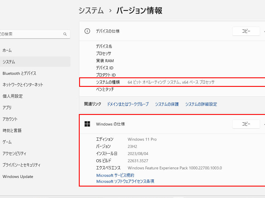 - OS 名: 使用中のオペレーティングシステム名(例: Windows 10 Pro)