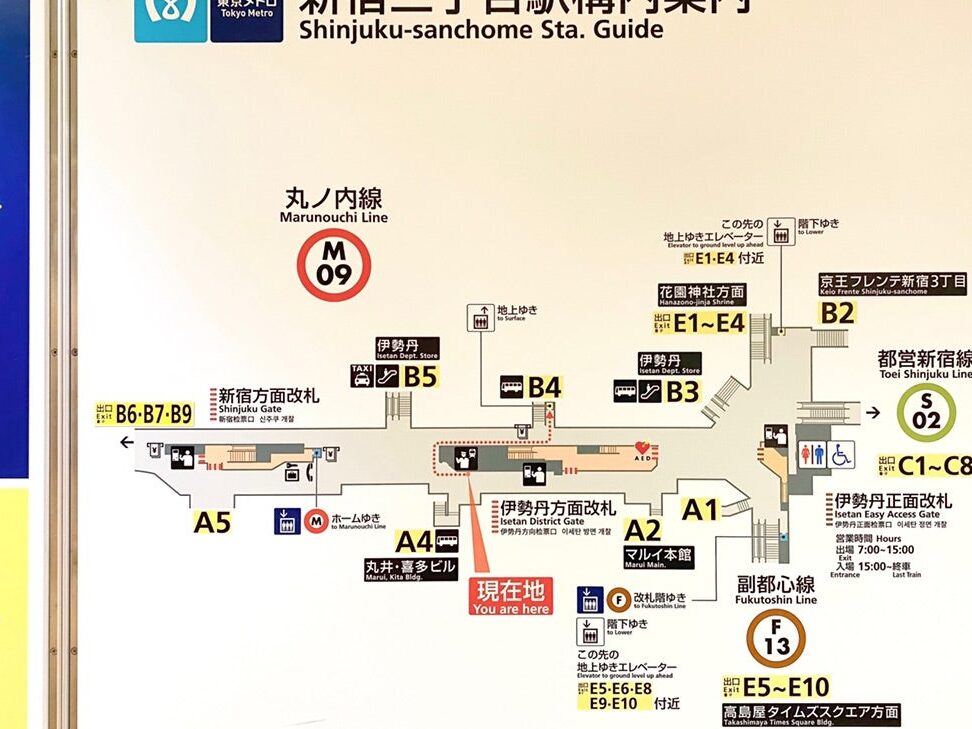 次に、有効なのは駅構内マップです。新宿三丁目駅では、各改札口やその周辺施設が記載された案内図があります。このマップによって、