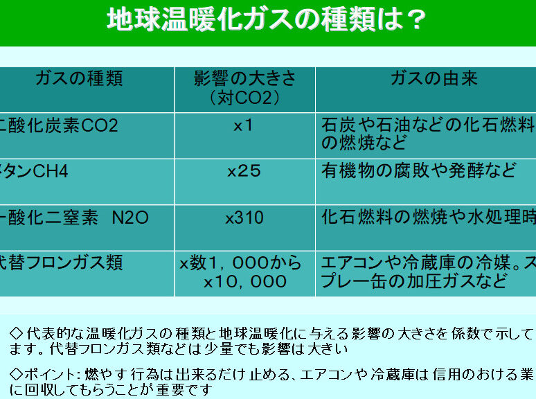 - 二酸化炭素 (CO2): GWP 1, 寿命 数百年~千年以上