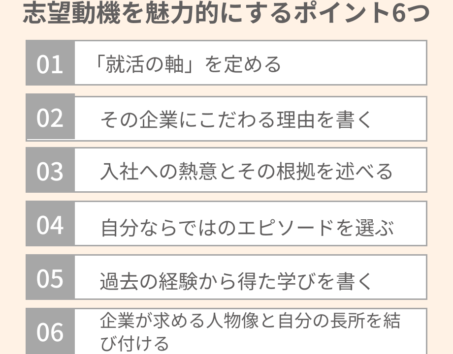 - 各志望理由には具体例や実績を織り交ぜ、単なる感情表現ではなく裏付けとなる証拠を提示します。