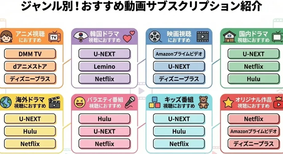 私たちが選択する動画配信サービスは、提供されるコンテンツのジャンルによっても大きく異なります。各サービスには特定のジャンルに強みを持つものがあり、視聴者は自分の好みに合った作品を見つけやすくなっています。このセクションでは、人気のある動画配信サービスごとにおすすめのコンテンツジャンルを比較し、それぞれの特徴を詳しく解説します。