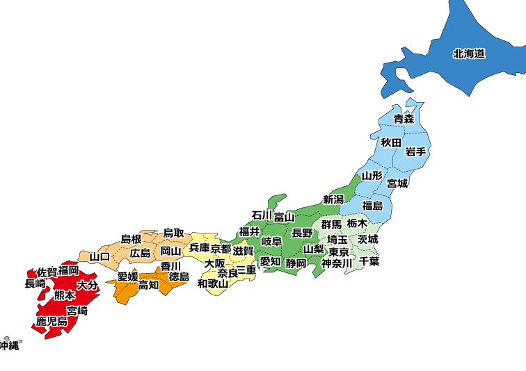 - 東北地方: 青森、岩手、宮城、秋田、山形、福島