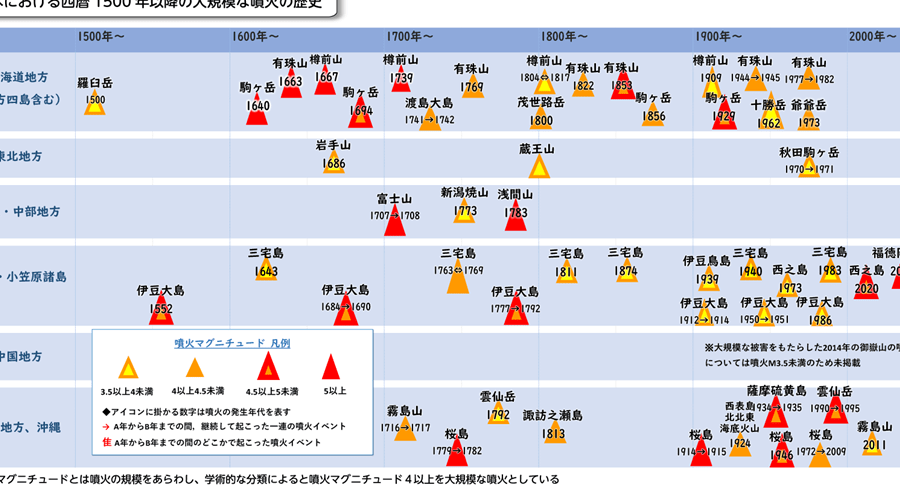 - リスク: 噴煙や溶岩流などが発生し、人々や環境への影響が大きい。