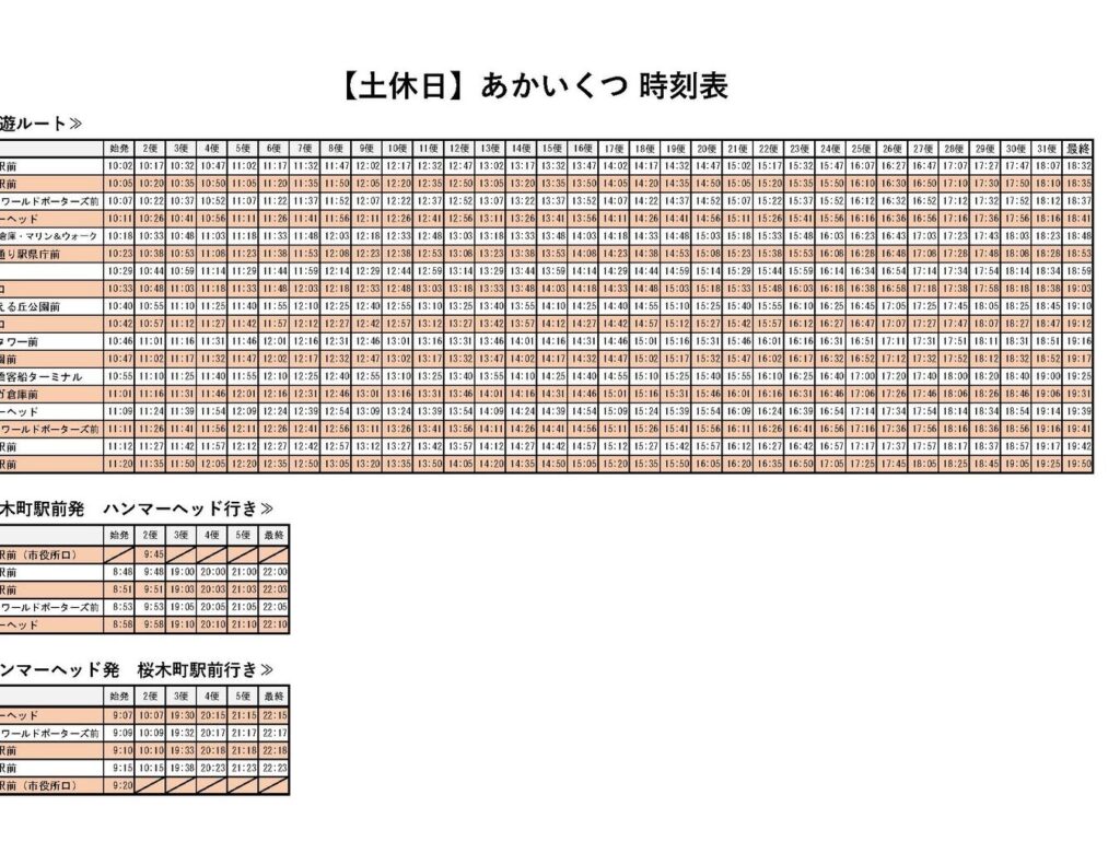 以下は、「バス あかいくつ」の代表的な路線ごとの運行時間を示した表です。