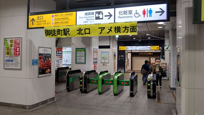 - 北口改札: 北口から出ると、多くの観光スポットへ徒歩で行けます。特にアメ横市場へのアクセスが良好です。