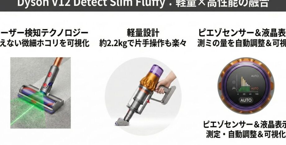 上記の表からもわかるように、各モデル間で吸引力やバッテリー寿命に違いがあります。特に、Dyson V15 Detectは最新技術を搭載しており、他のモデルと比べて圧倒的な吸引力を誇ります。この高い吸引力は、微細なホコリやアレルゲンまで徹底的にキャッチできることにつながっています。