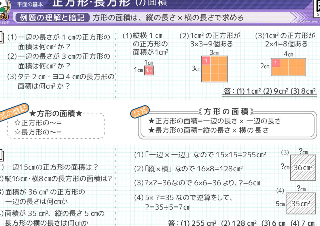 - 面積: 辺の長さをaとした場合、その面積AはA = a²となります。