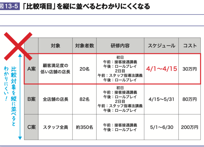- 評価基準:重要な要素(コスト、時間、品質など)を行として設定します。