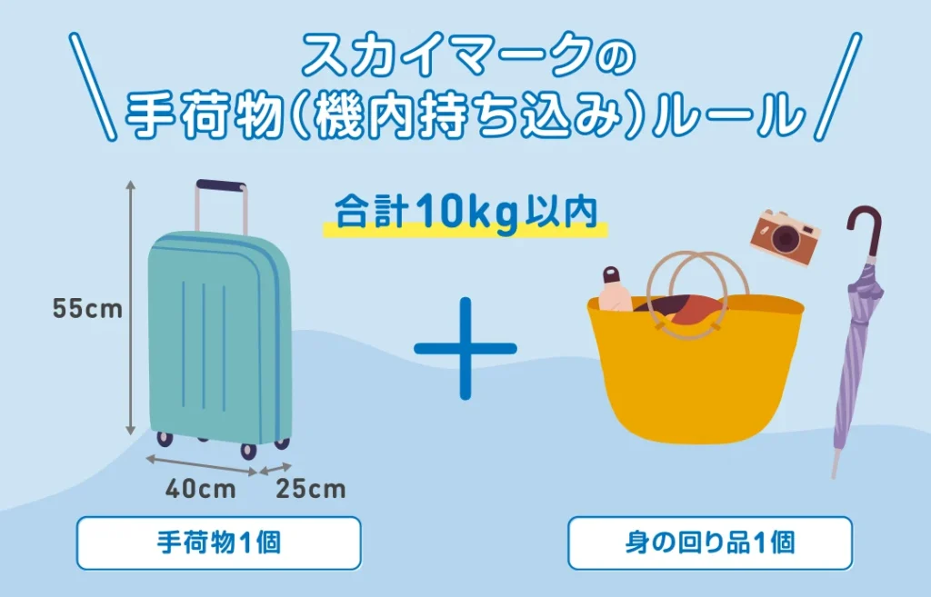 - 手荷物のサイズ制限: 最大寸法は通常55cm×40cm×25cm程度。