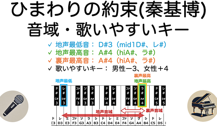 曲全体としては、以下のような音域で歌うことが推奨されます: