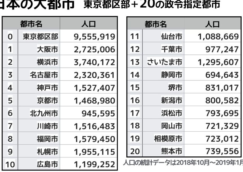これらのデータを見ると、政令指定都市にはそれぞれ異なる規模や特徴があることがわかります。例えば、横浜市は日本で最も人口が多く、その経済圏は非常に強力です。一方で、札幌市や仙台市などは地域特有の文化や自然環境を活かした独自性があります。