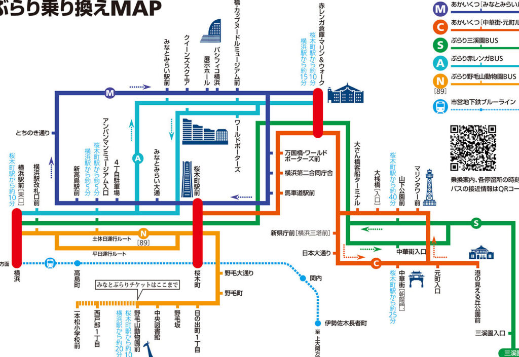 以下に、横浜あかいくつ号の主な運行ルートと各停留所を示します。