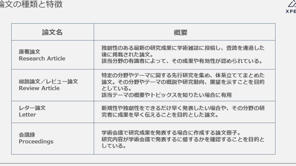 以下に挙げるのは、我々がよく目にする論文 いくつかの主要な種類です: