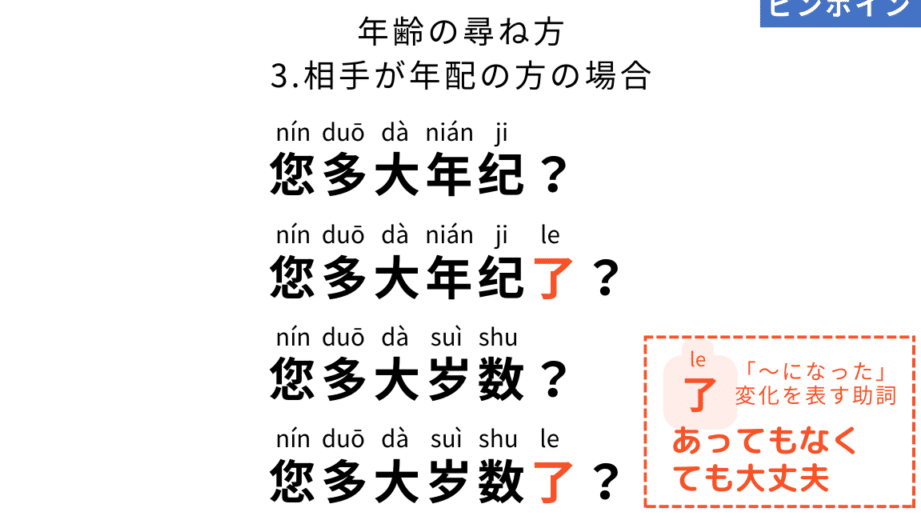 - 您多大了? (nín duō dà le?) – あなたは何歳ですか?(丁寧)