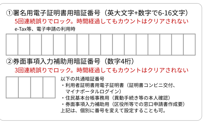 - マイナンバーカード:カードの裏面には、申請時に設定した暗証番号が記載されています。