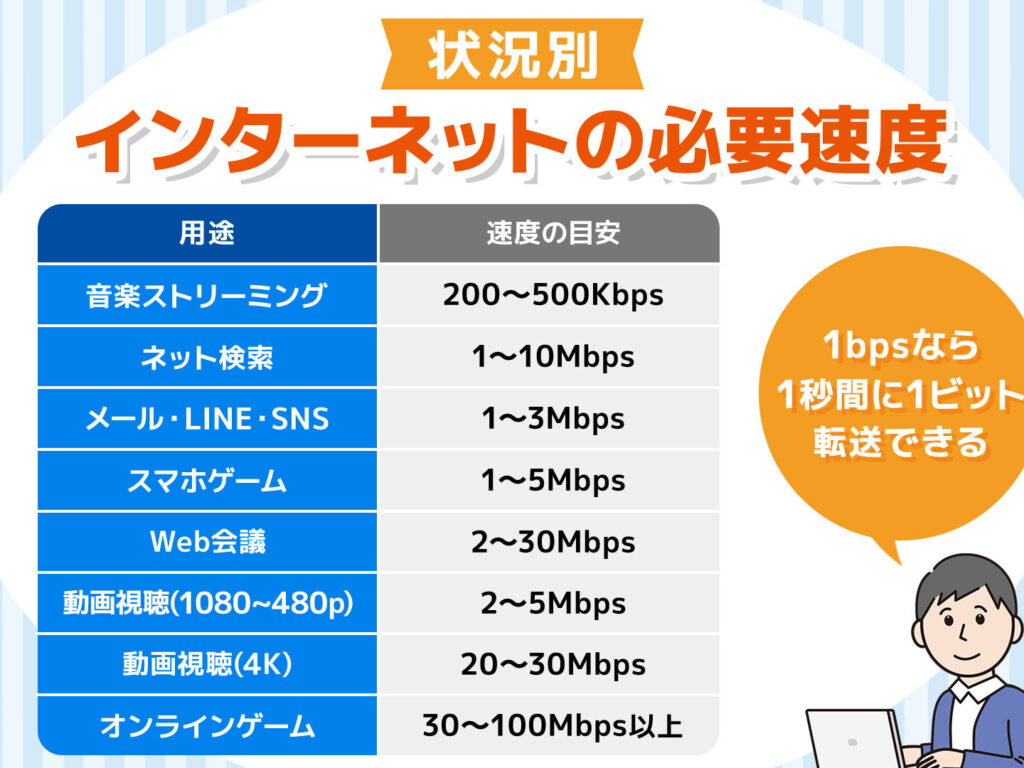 | オンラインゲーム | 3 – 6 Mbps(pingも考慮) | 遅延が少ない安定した接続が求められ、高いMbpsだけではなくプレイ時間も影響します。 |