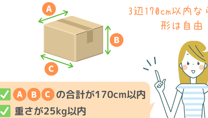 大型荷物では最大10kgまで発送可能ですが、総合的な寸法(縦・横・高さ)の合計が100cm以内である必要があります。このカテゴリーには家具や家電製品など大きめの商品が含まれることから、一部比率によって追加料金が発生する場合がありますので注意しましょう。